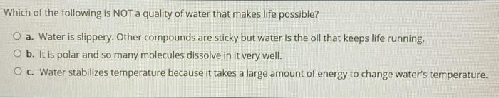 for "Sticky Molecules Answers / Solved Which Of The Following Is Not A Quality Of Water T Chegg Com"